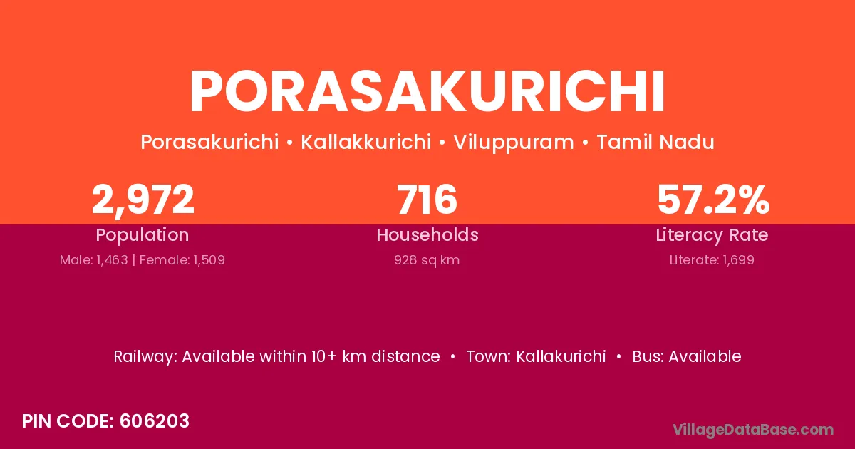 Kallakurichi is the nearest town to Porasakurichi village for major economic activities