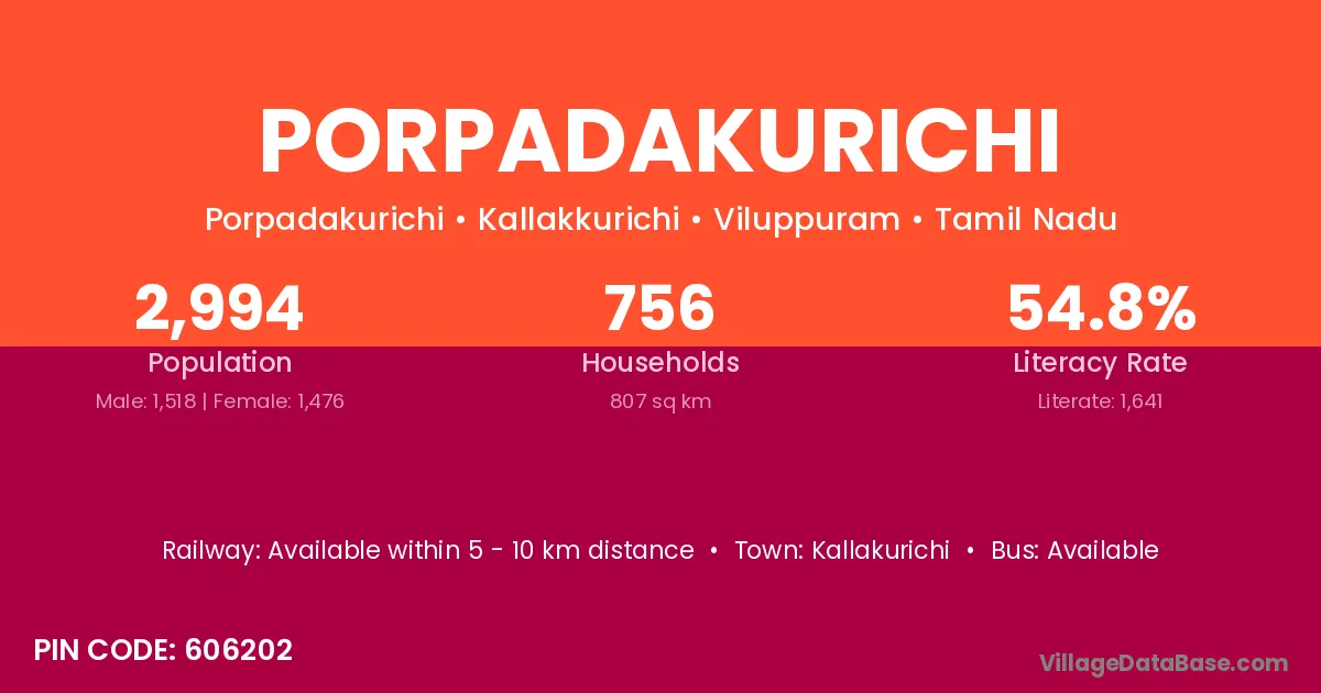 According to Census 2011 information, the village code of Porpadakurichi village is 606202.