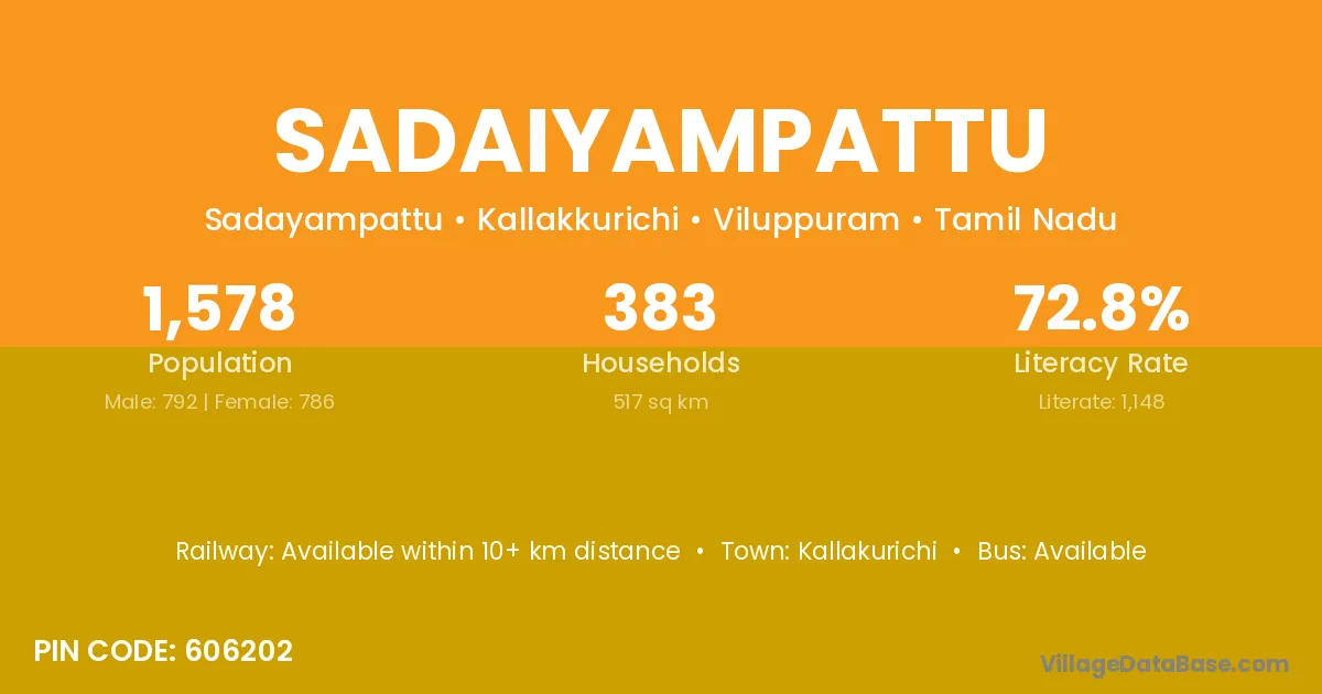 Sadaiyampattu village has a total population of 1,578 people, of which 792 are males and 786 are females.