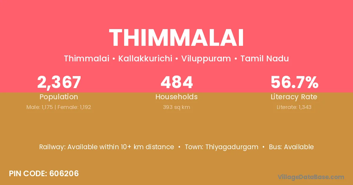 Thimmalai village has a total population of 2,367 people, of which 1,175 are males and 1,192 are females.