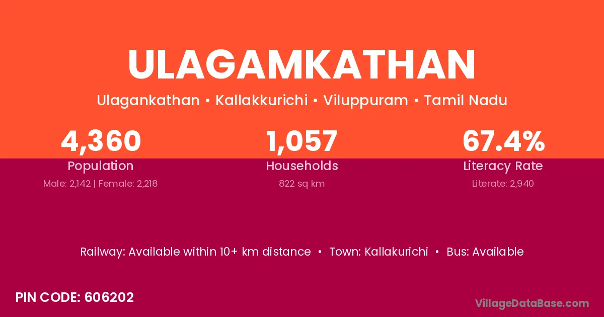 Ulagamkathan village has a total population of 4,360 people, of which 2,142 are males and 2,218 are females.