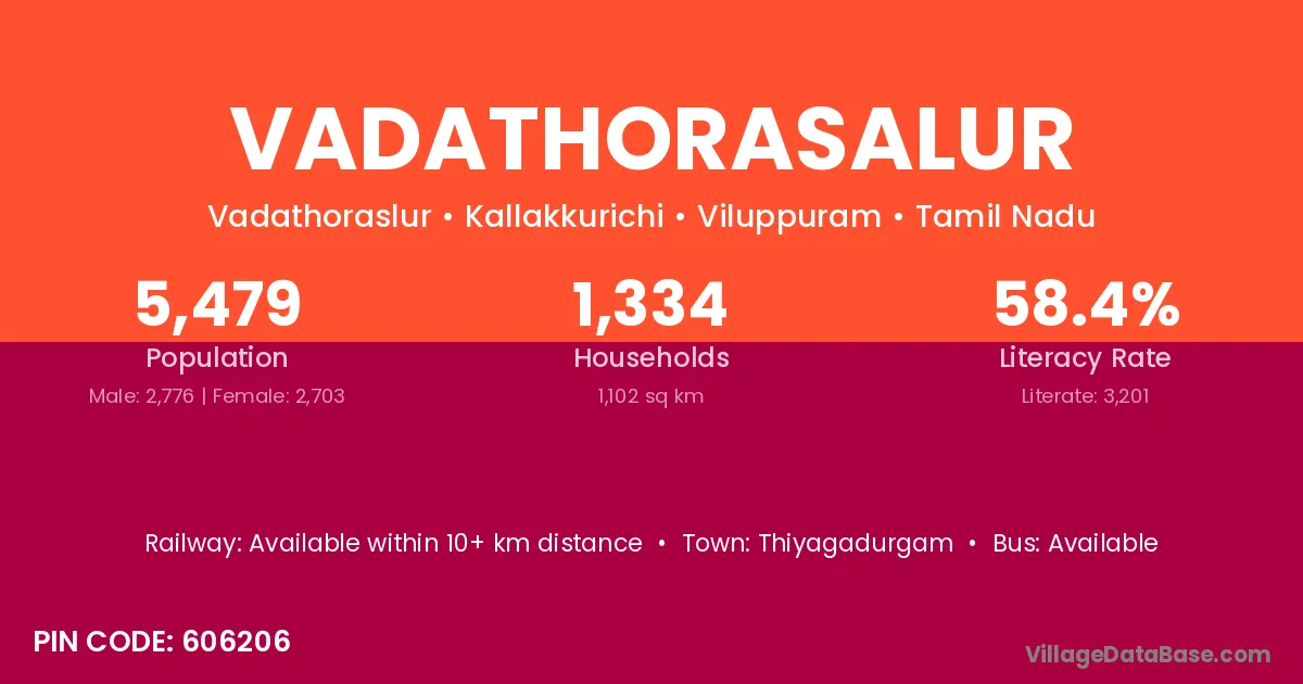 The literacy rate of Vadathorasalur village is 58.42%. Male literacy stands at 65.42% and female literacy at 51.24%.