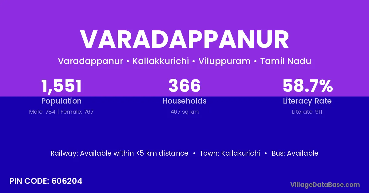 Varadappanur village has a total population of 1,551 people, of which 784 are males and 767 are females.