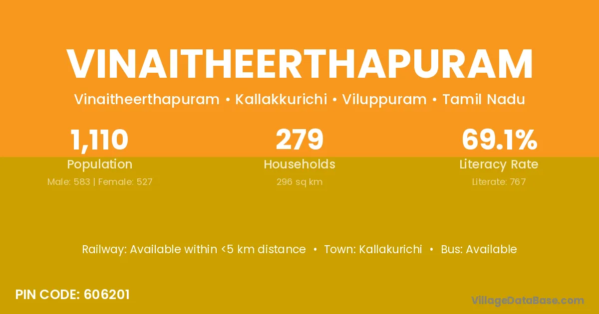 Vinaitheerthapuram village has a total population of 1,110 people, of which 583 are males and 527 are females.