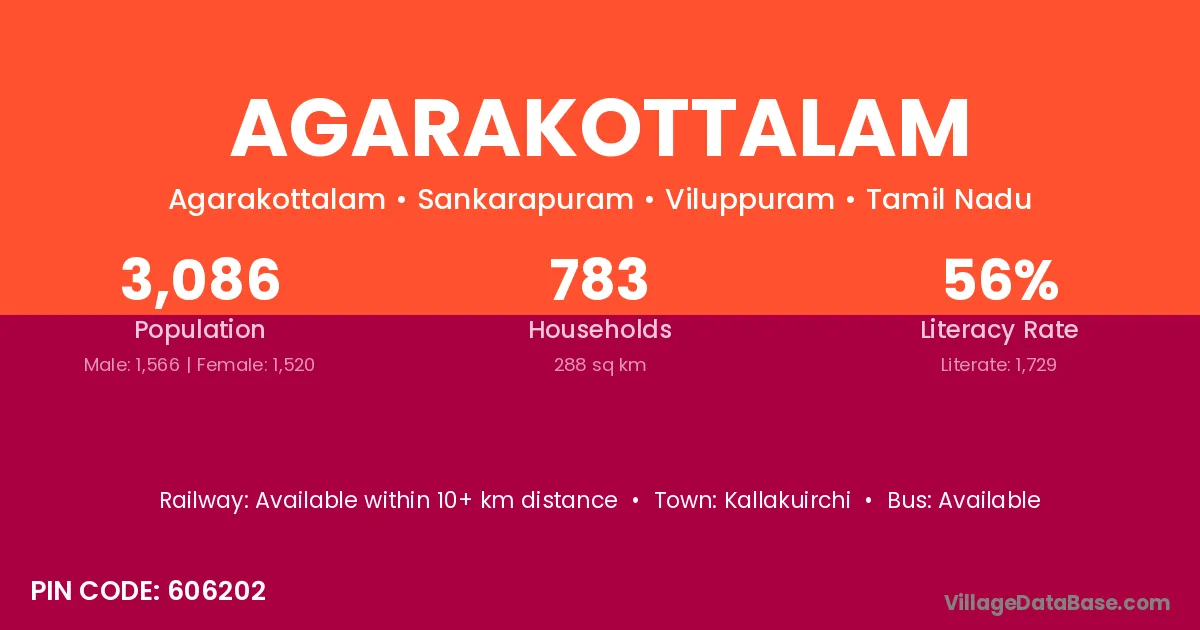 Agarakottalam village has a total population of 3,086 people, of which 1,566 are males and 1,520 are females.