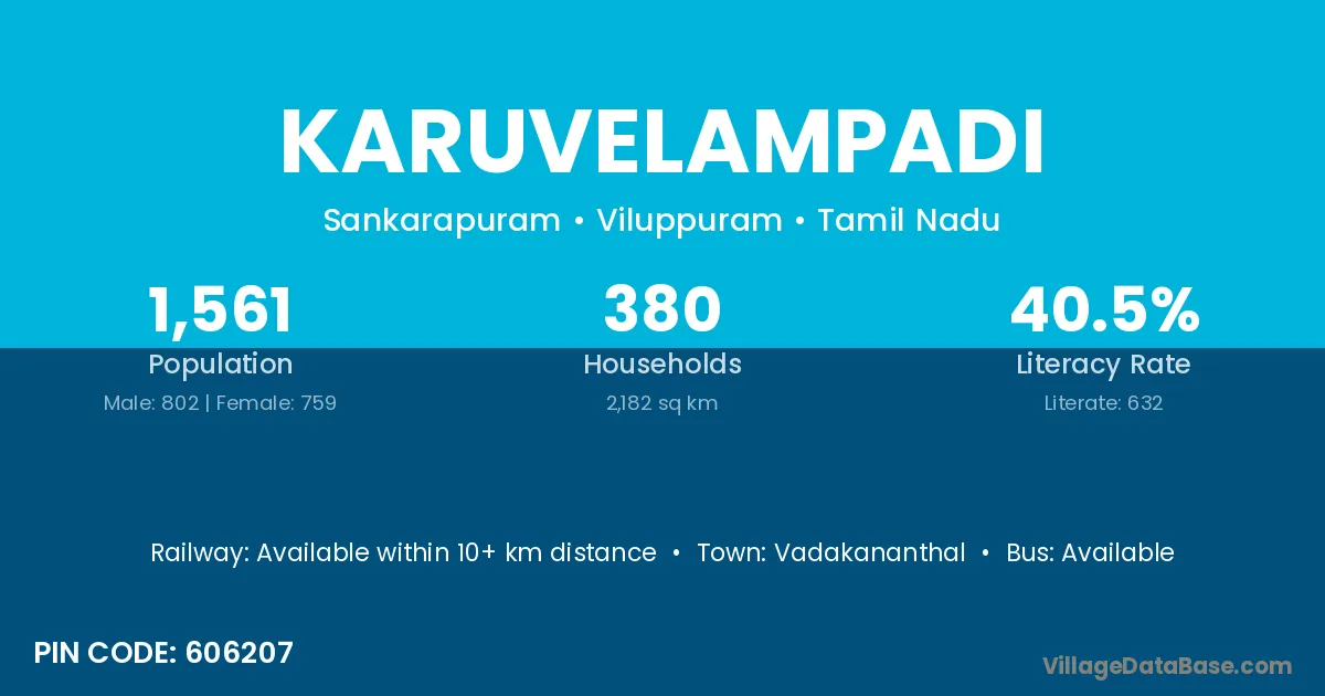 Karuvelampadi village has a total population of 1,561 people, of which 802 are males and 759 are females.