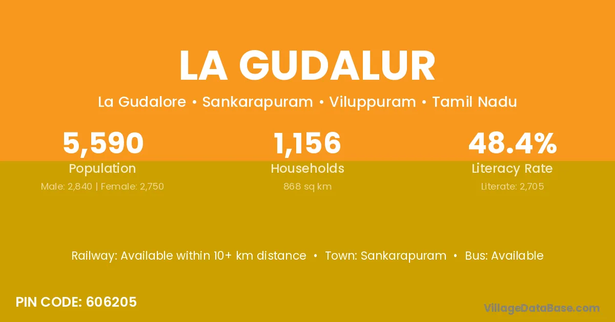 The literacy rate of La Gudalur village is 48.39%. Male literacy stands at 56.30% and female literacy at 40.22%.