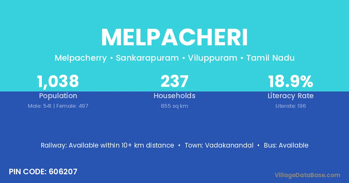 Melpacheri village has a total population of 1,038 people, of which 541 are males and 497 are females.