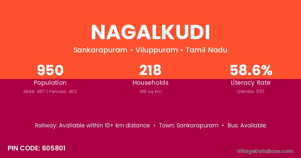 Nagalkudi village has a total population of 950 people, of which 487 are males and 463 are females.