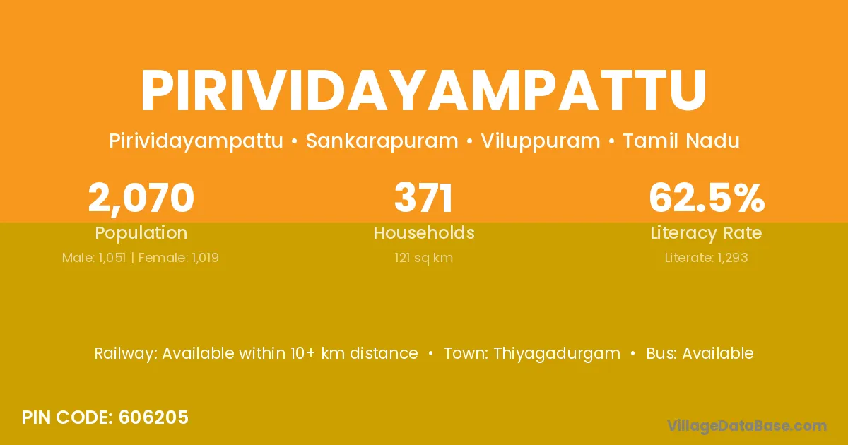 Pirividayampattu village has a total population of 2,070 people, of which 1,051 are males and 1,019 are females.