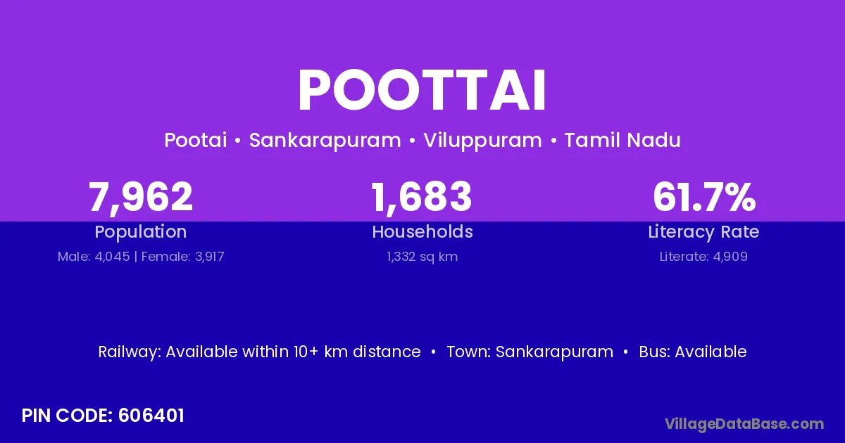 Poottai village has a total population of 7,962 people, of which 4,045 are males and 3,917 are females.
