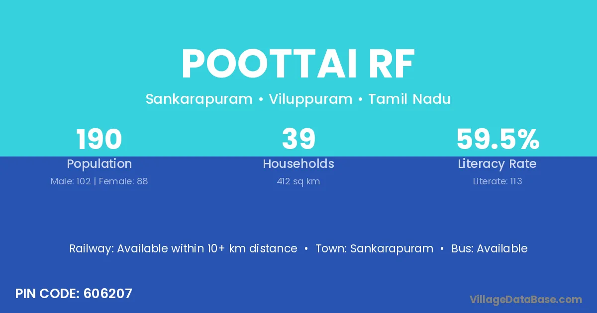 Poottai Rf village has a total population of 190 people, of which 102 are males and 88 are females.