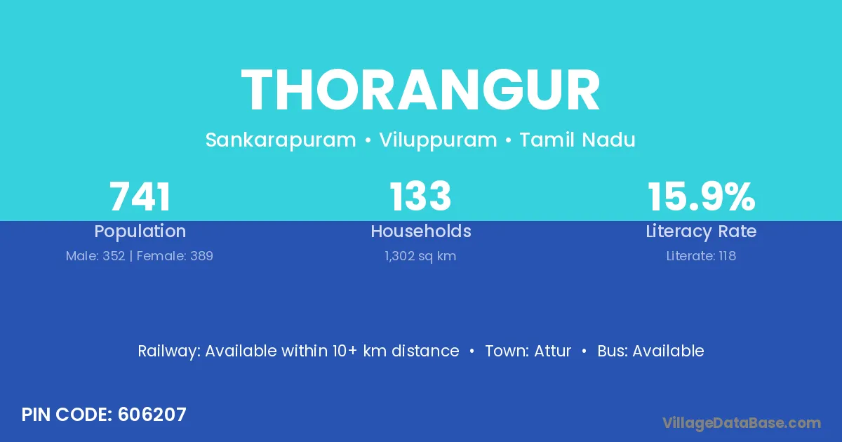 Thorangur village has a total population of 741 people, of which 352 are males and 389 are females.