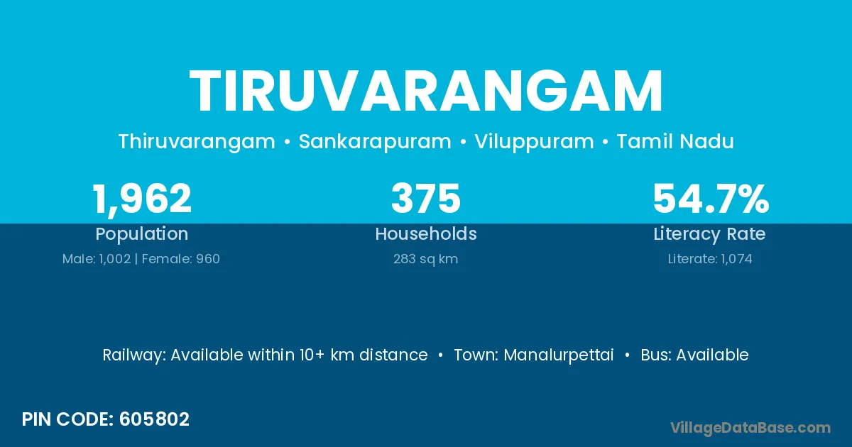 Tiruvarangam village has a total population of 1,962 people, of which 1,002 are males and 960 are females.