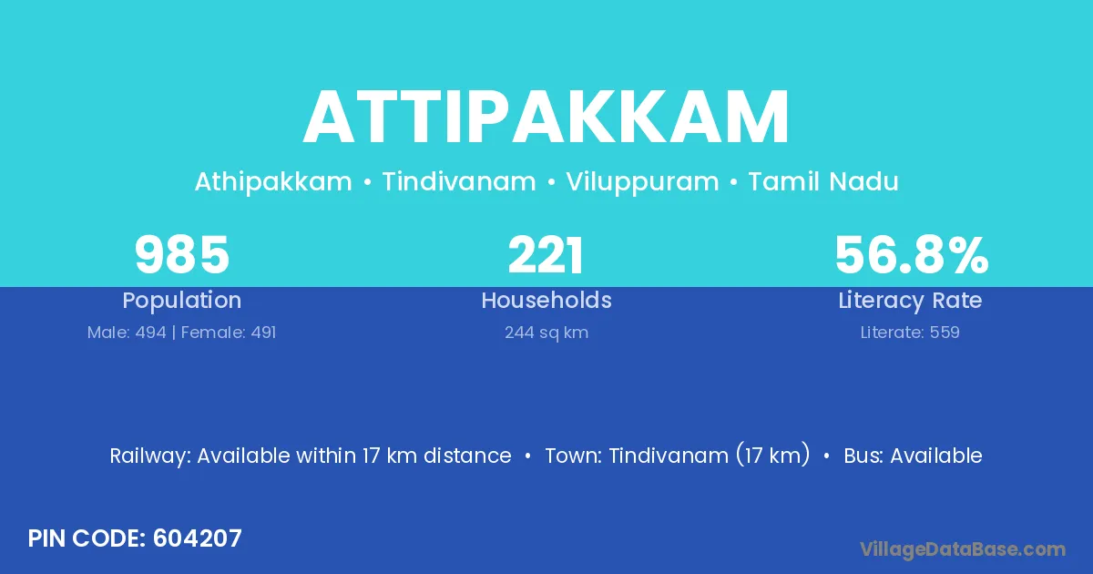 Attipakkam village has a total population of 985 people, of which 494 are males and 491 are females.