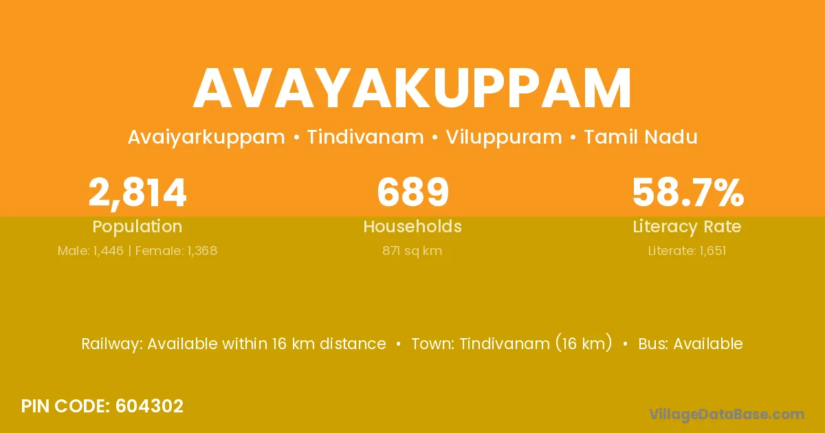 Tindivanam (16 km) is the nearest town to Avayakuppam village for major economic activities and is located approximately 16 km away.