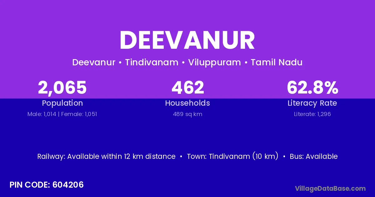 Tindivanam (10 km) is the nearest town to Deevanur village for major economic activities and is located approximately 10 km away.