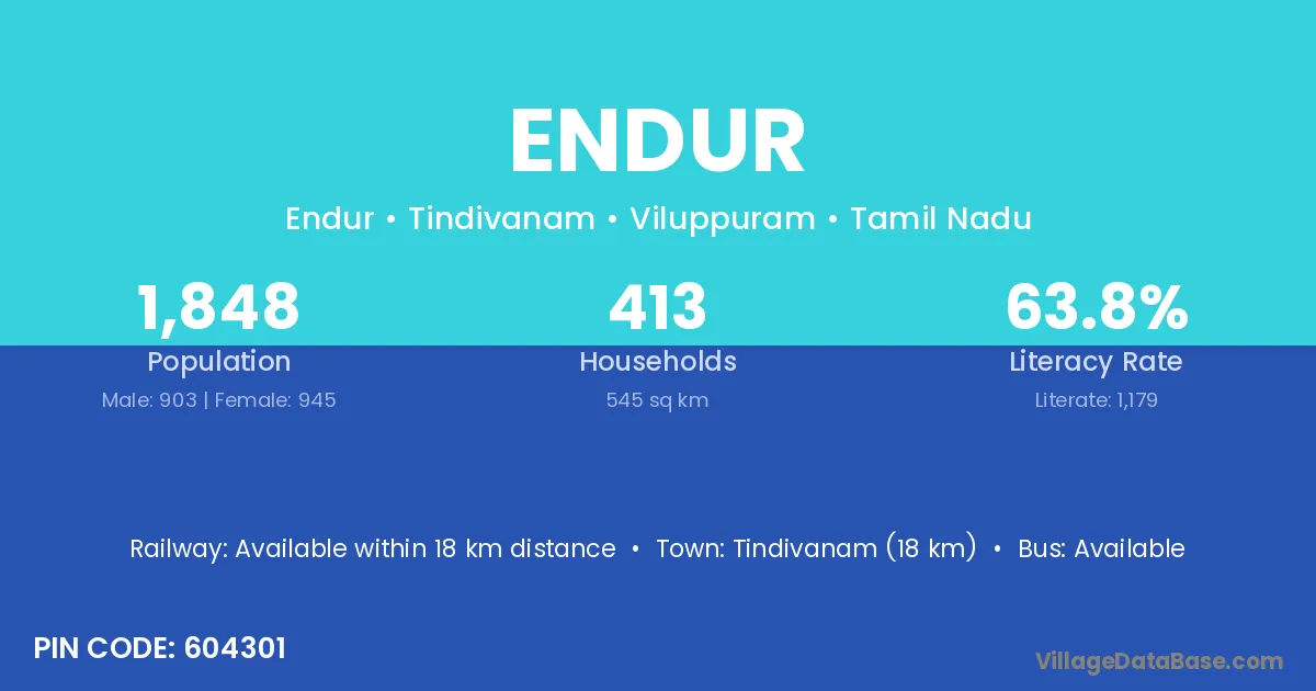 Tindivanam (18 km) is the nearest town to Endur village for major economic activities and is located approximately 18 km away.