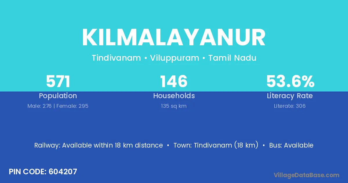 Tindivanam (18 km) is the nearest town to Kilmalayanur village for major economic activities and is located approximately 18 km away.