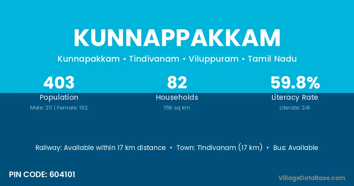 Tindivanam (17 km) is the nearest town to Kunnappakkam village for major economic activities and is located approximately 17 km away.