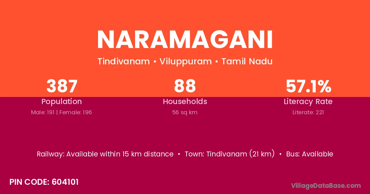 Tindivanam (21 km) is the nearest town to Naramagani village for major economic activities and is located approximately 21 km away.