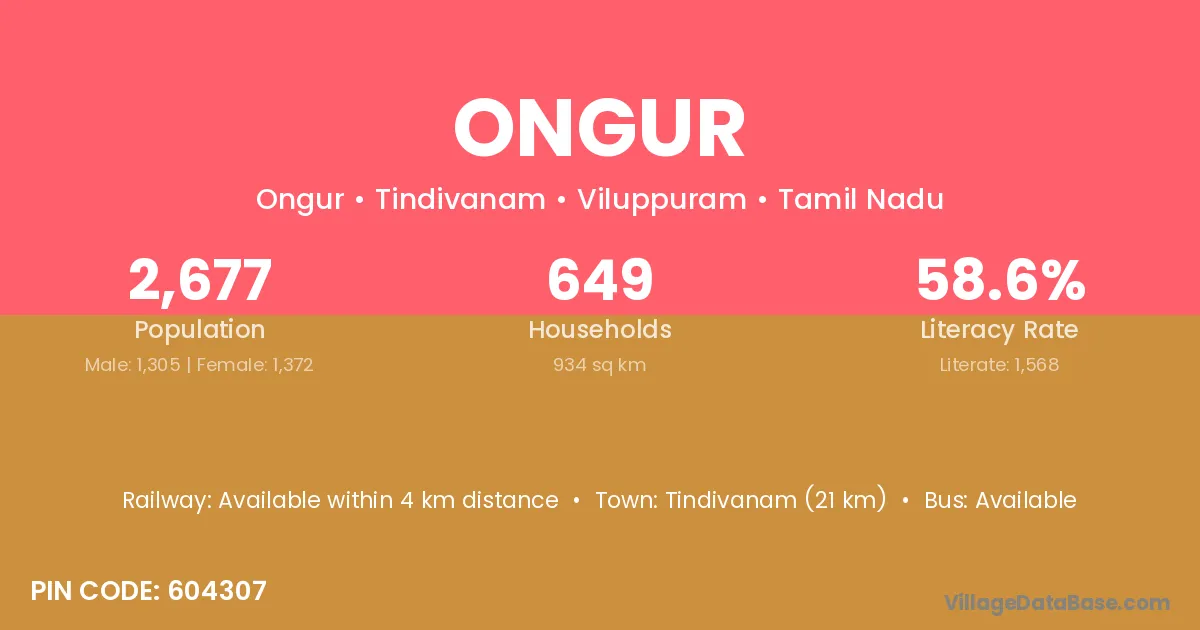Tindivanam (21 km) is the nearest town to Ongur village for major economic activities and is located approximately 21 km away.