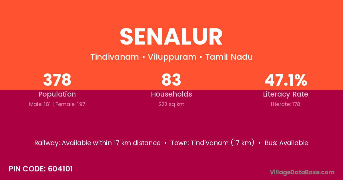 Tindivanam (17 km) is the nearest town to Senalur village for major economic activities and is located approximately 17 km away.