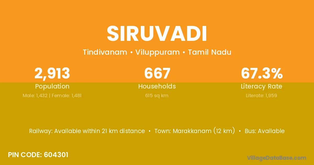 Marakkanam (12 km) is the nearest town to Siruvadi village for major economic activities and is located approximately 12 km away.