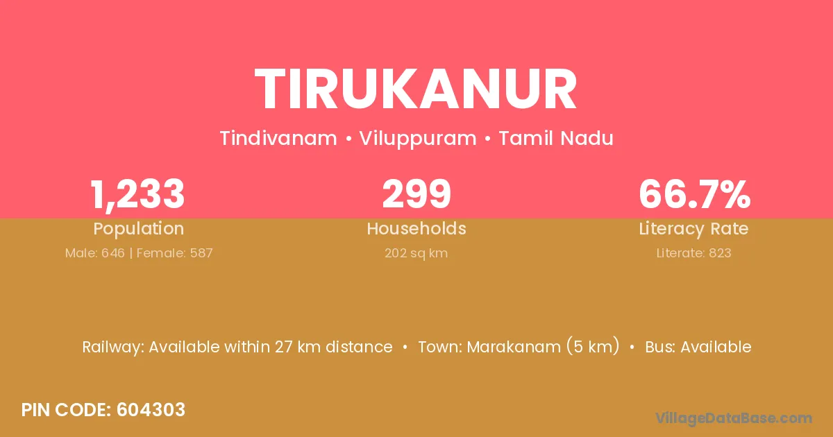 Tirukanur village has a total population of 1,233 people, of which 646 are males and 587 are females.
