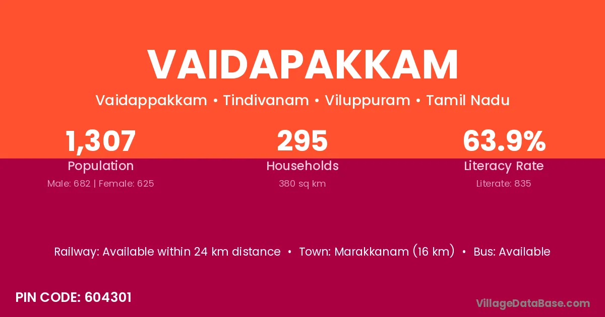 Vaidapakkam village has a total population of 1,307 people, of which 682 are males and 625 are females.