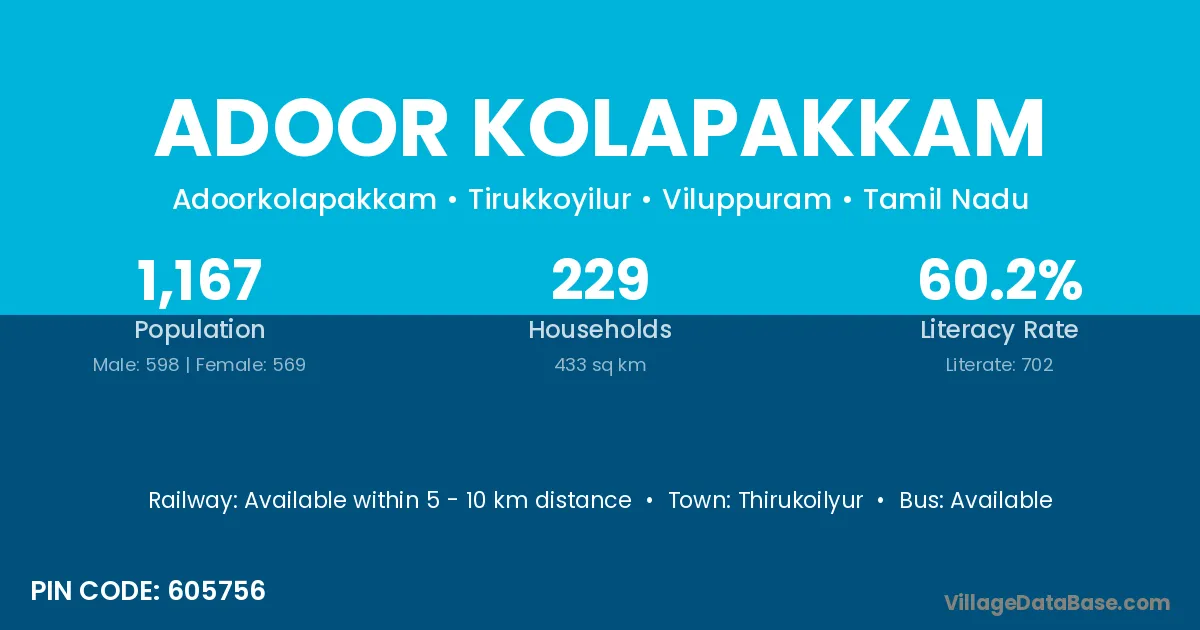 Adoor Kolapakkam village has a total population of 1,167 people, of which 598 are males and 569 are females.