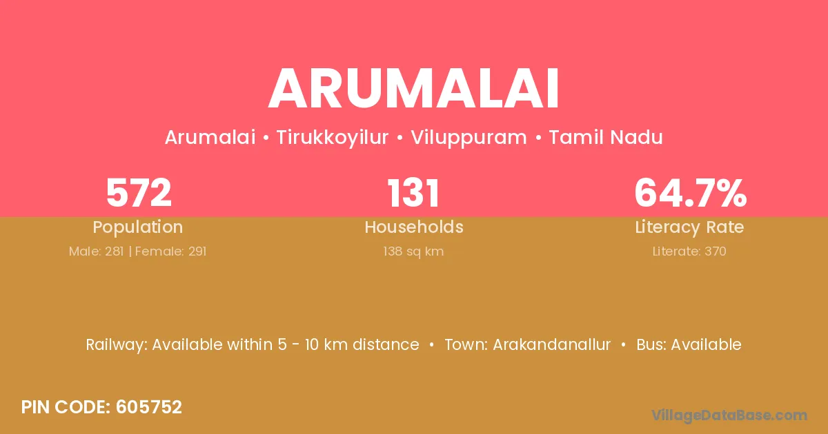 Arumalai village has a total population of 572 people, of which 281 are males and 291 are females.