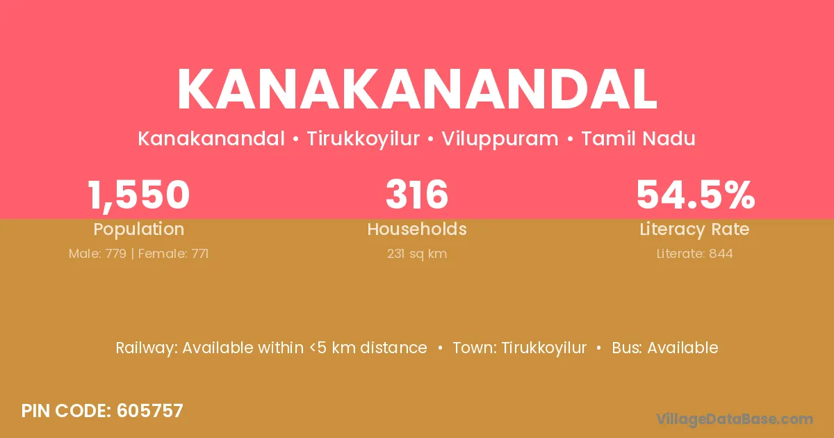 Kanakanandal village has a total population of 1,550 people, of which 779 are males and 771 are females.
