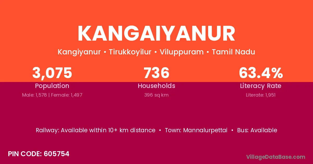 Kangaiyanur village has a total population of 3,075 people, of which 1,578 are males and 1,497 are females.