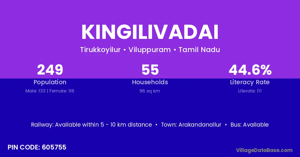 Kingilivadai village has a total population of 249 people, of which 133 are males and 116 are females.