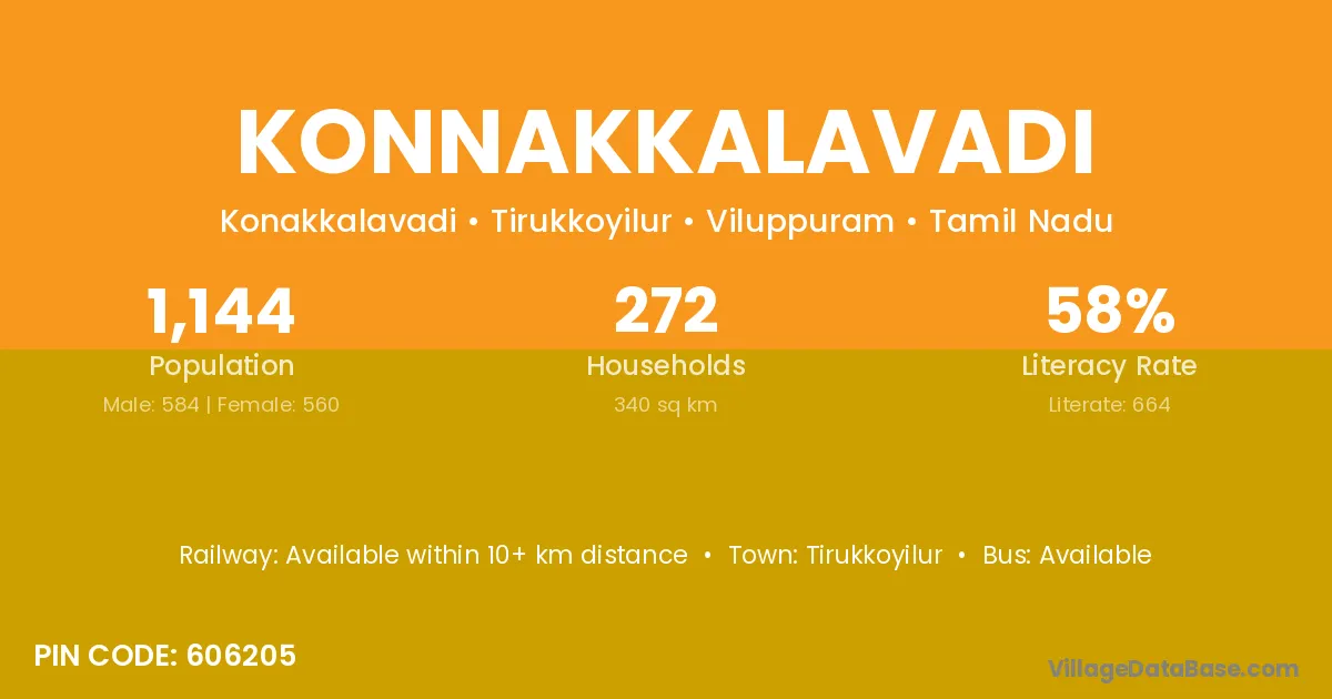 Konnakkalavadi village has a total population of 1,144 people, of which 584 are males and 560 are females.