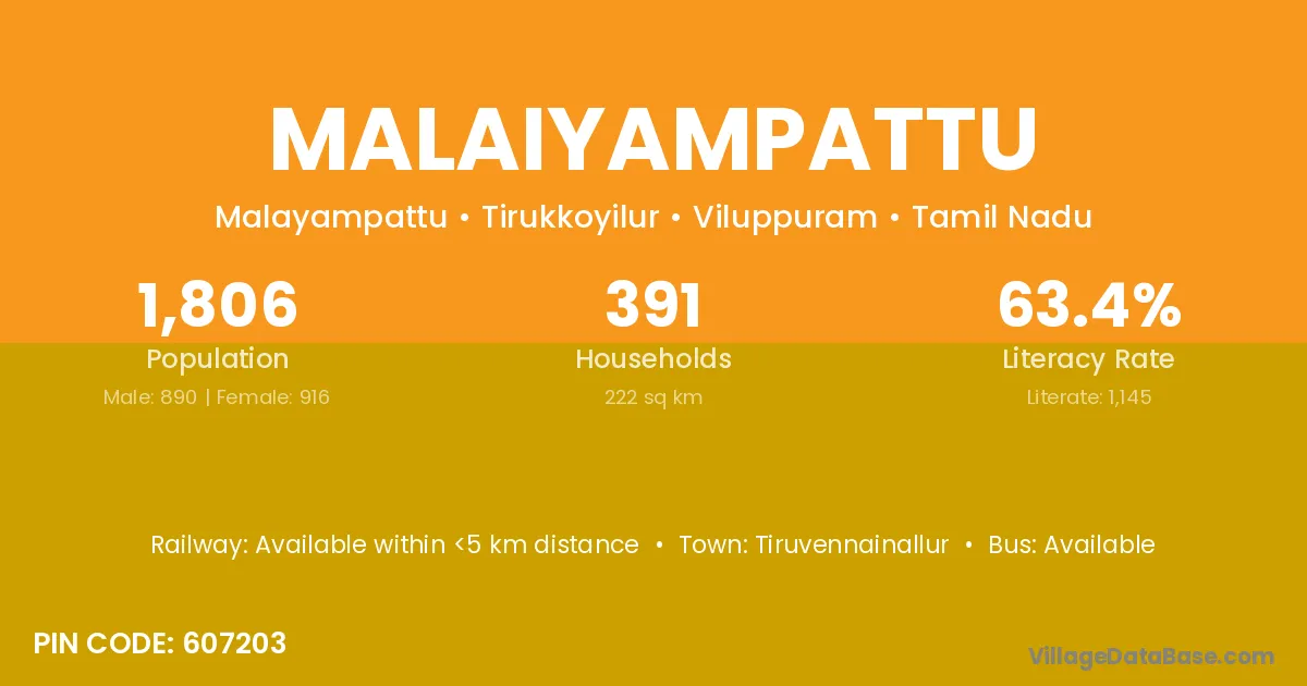 Malaiyampattu village has a total population of 1,806 people, of which 890 are males and 916 are females.