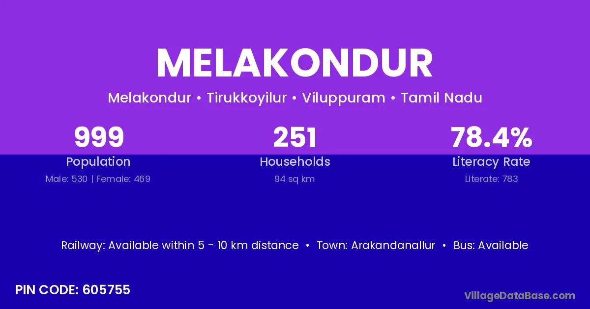 Melakondur village has a total population of 999 people, of which 530 are males and 469 are females.