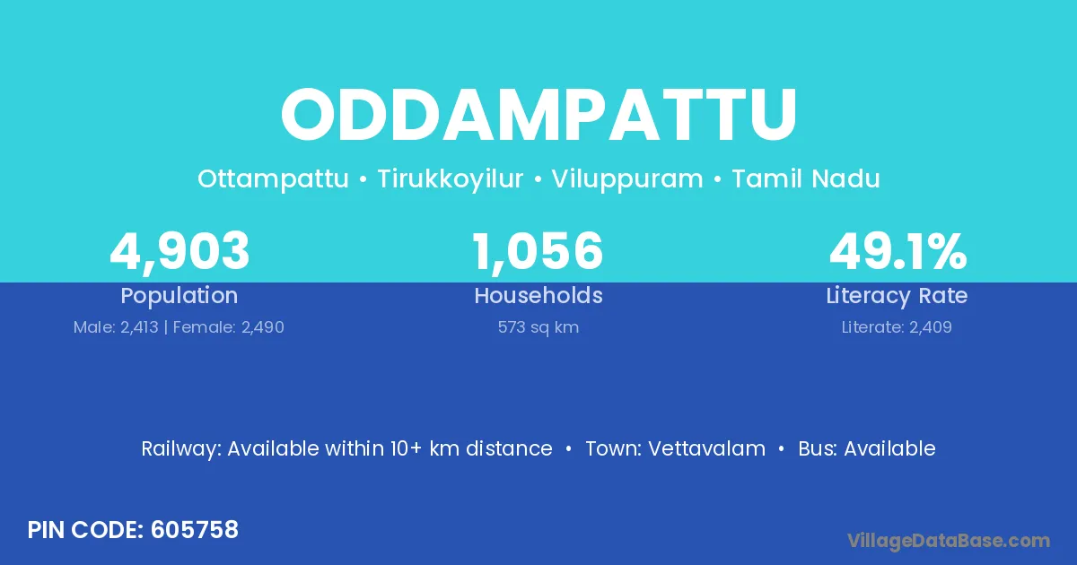 Oddampattu village has a total population of 4,903 people, of which 2,413 are males and 2,490 are females.