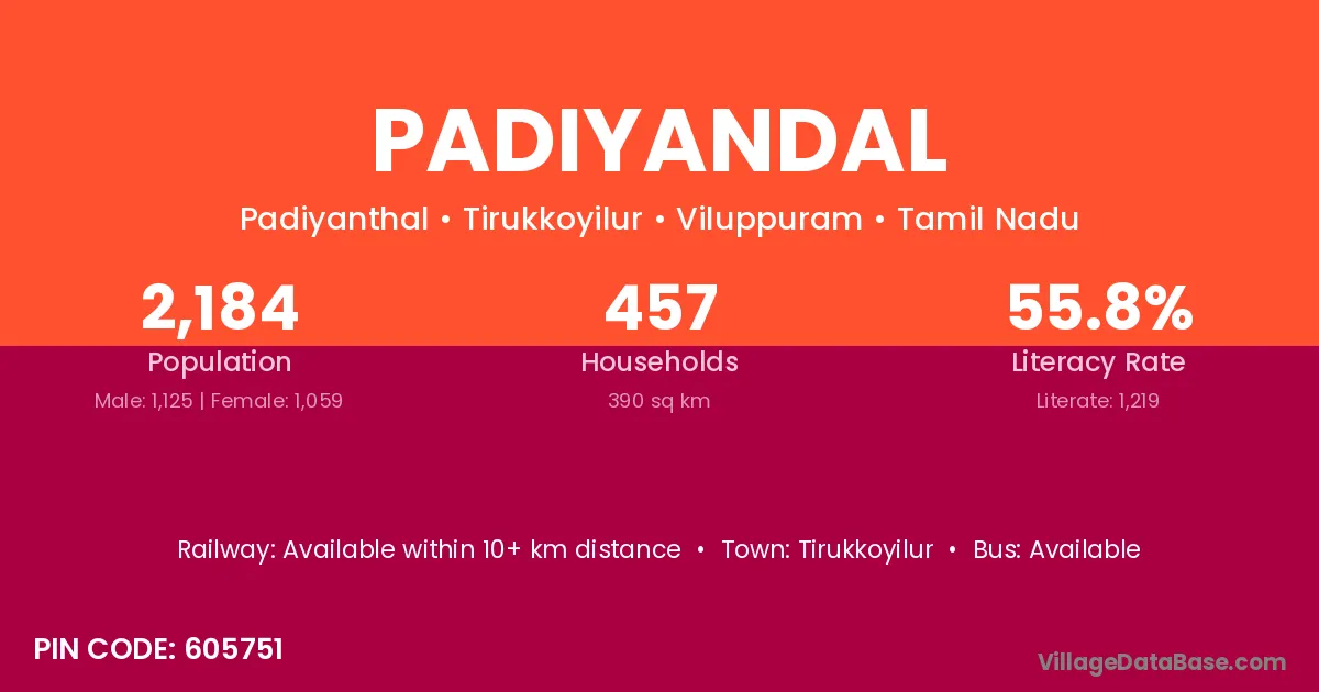 Padiyandal village has a total population of 2,184 people, of which 1,125 are males and 1,059 are females.
