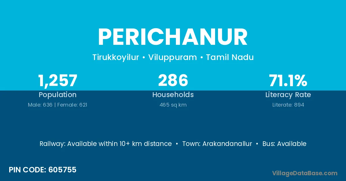 Perichanur village has a total population of 1,257 people, of which 636 are males and 621 are females.