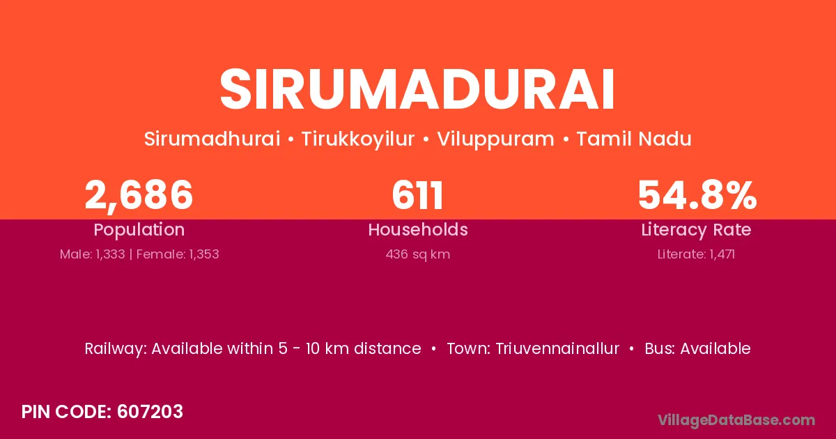 Sirumadurai village has a total population of 2,686 people, of which 1,333 are males and 1,353 are females.