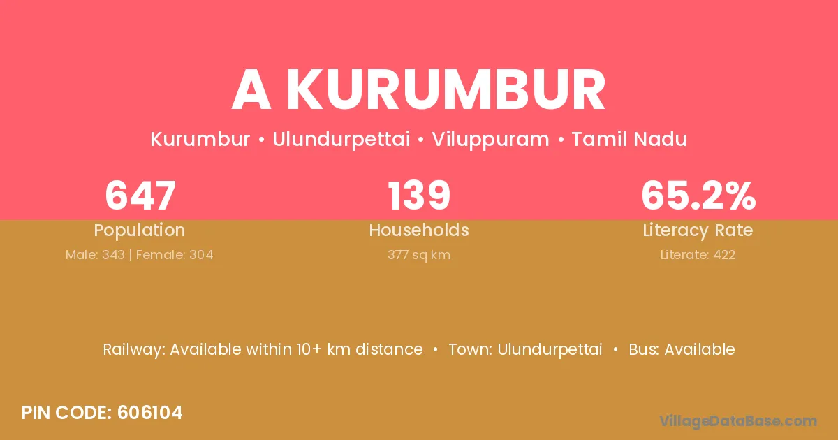 Ulundurpettai is the nearest town to A Kurumbur village for major economic activities