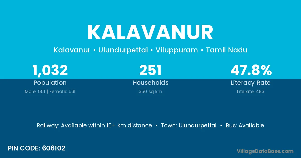 Kalavanur village has a total population of 1,032 people, of which 501 are males and 531 are females.