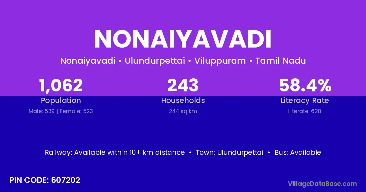 Nonaiyavadi village has a total population of 1,062 people, of which 539 are males and 523 are females.