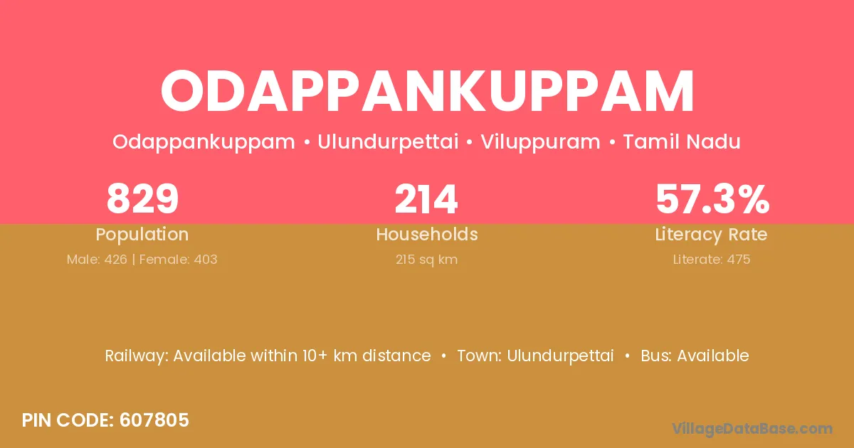 Odappankuppam village has a total population of 829 people, of which 426 are males and 403 are females.