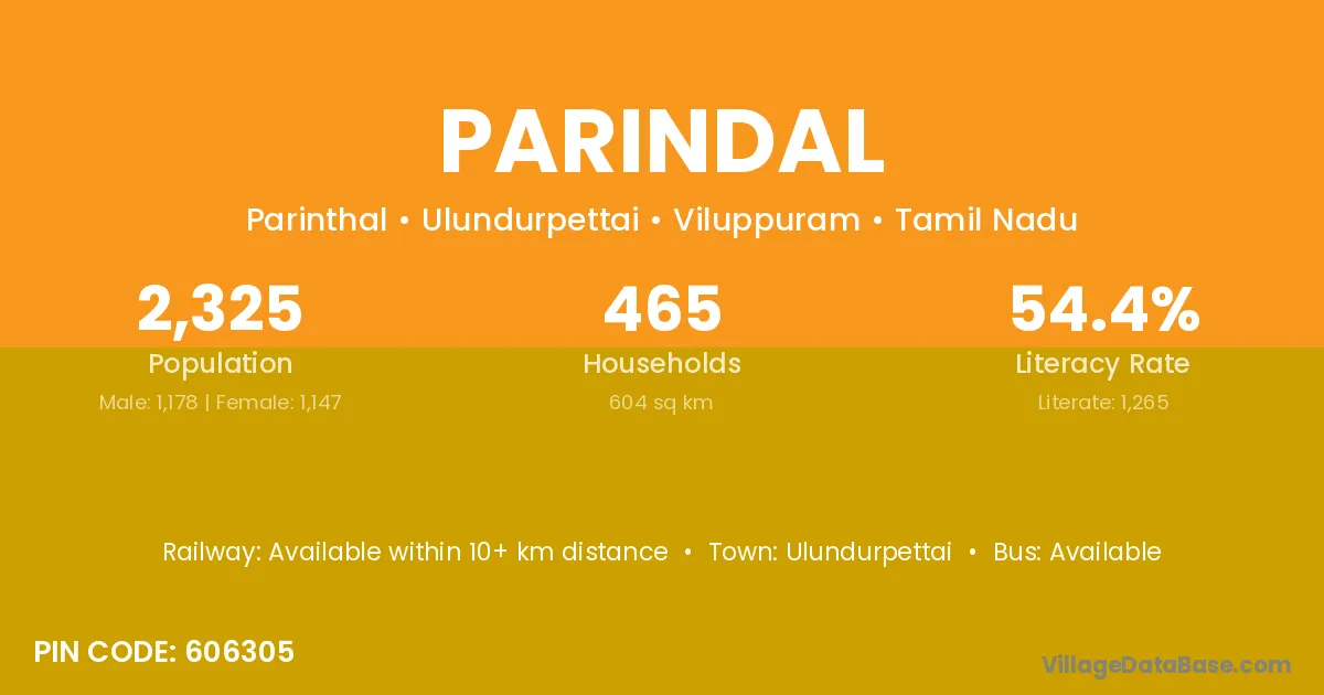 Ulundurpettai is the nearest town to Parindal village for major economic activities