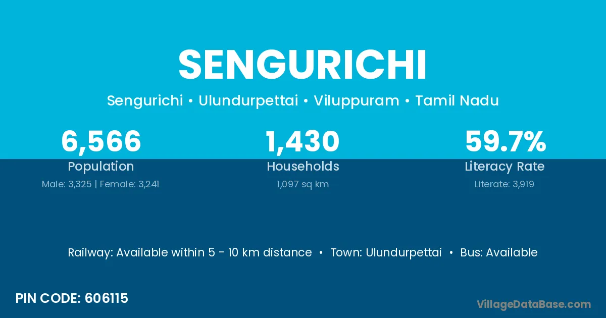 Sengurichi village has a total population of 6,566 people, of which 3,325 are males and 3,241 are females.