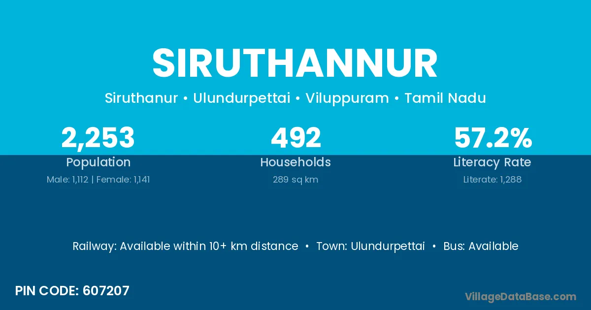 Siruthannur village has a total population of 2,253 people, of which 1,112 are males and 1,141 are females.
