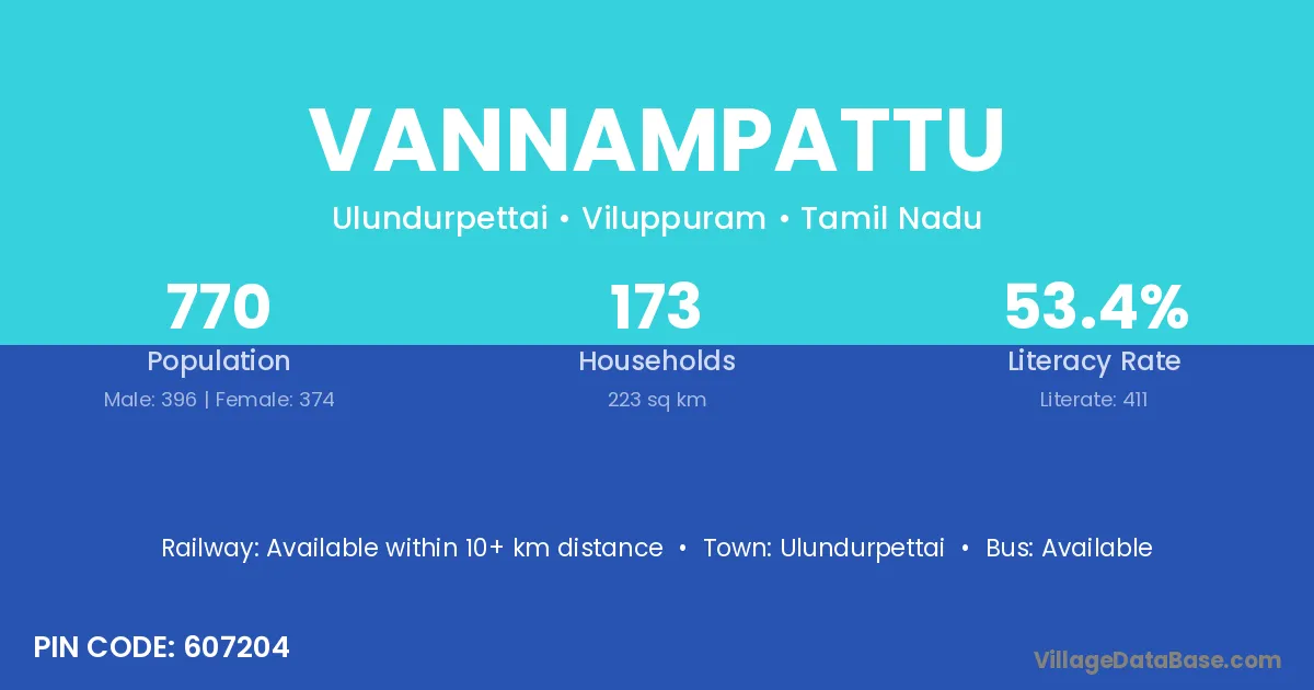 Vannampattu village has a total population of 770 people, of which 396 are males and 374 are females.